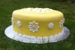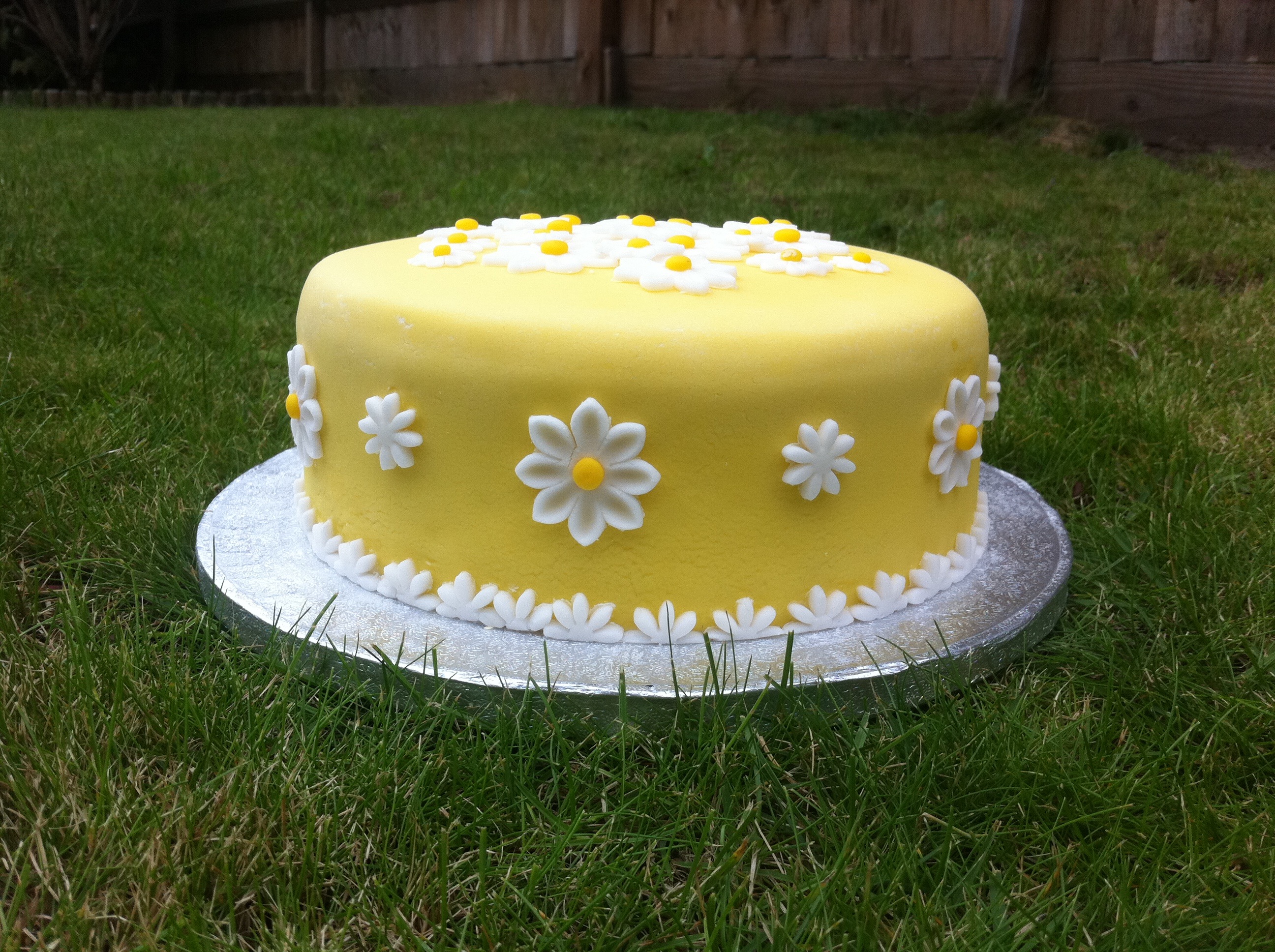 This time I also took a tip from my friend Claire that a cake is easier to ice when frozen. So I made the sponge the night before and stuck it in the freezer overnight. I took the cake out the freezer the day before the party and applied the sugarpaste onto the frozen cake – & lo and behold no filling bulge out of the side or any top tier slide as I experienced when decorating my daughters cake the month before. I also managed to get the icing much thinner this time and found that sticking half-flowers around the bottom of the cake hides a multitude of sins without the use of a ribbon, so win win all round 🙂