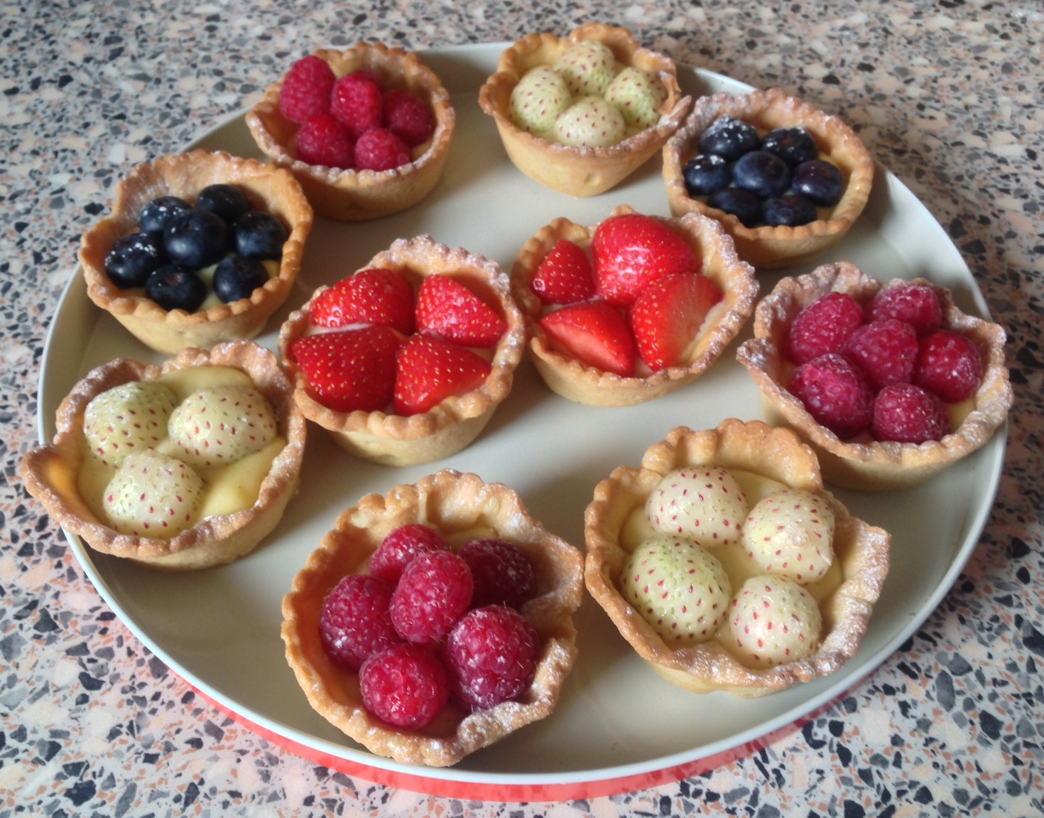 I topped the tarts of with a selection of fruits, most notably the pineberry (an inverse strawberry with white flesh skin and red seeds) which proved to be a talking point but were also the last to be eaten, so maybe just a bit too off the wall.