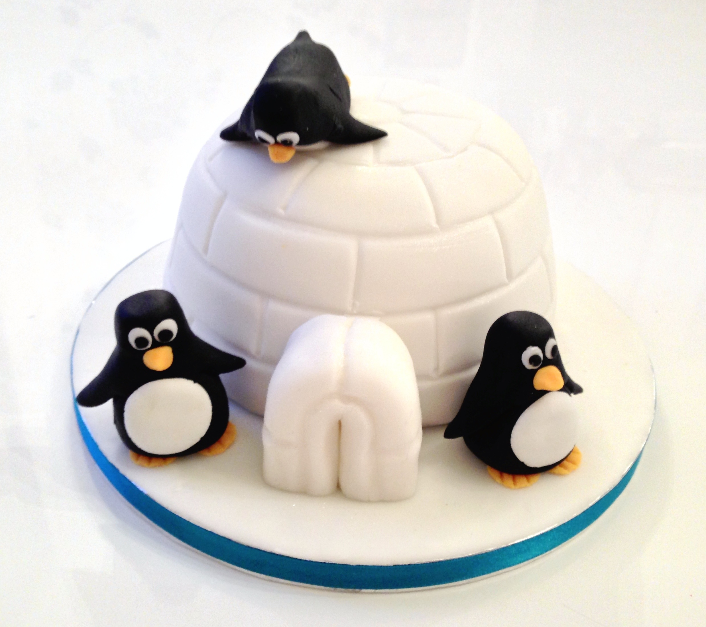 I came up with this idea whilst looking though Christmas cake images on Google. I made the igloo shaped cake using a Pyrex bowl – a technique I had already tried and tested with my Christmas Pudding Christmas Cake. I covered the cake in marzipan and then a layer of white sugarpaste, into which I scored lines to create the ice block structure.