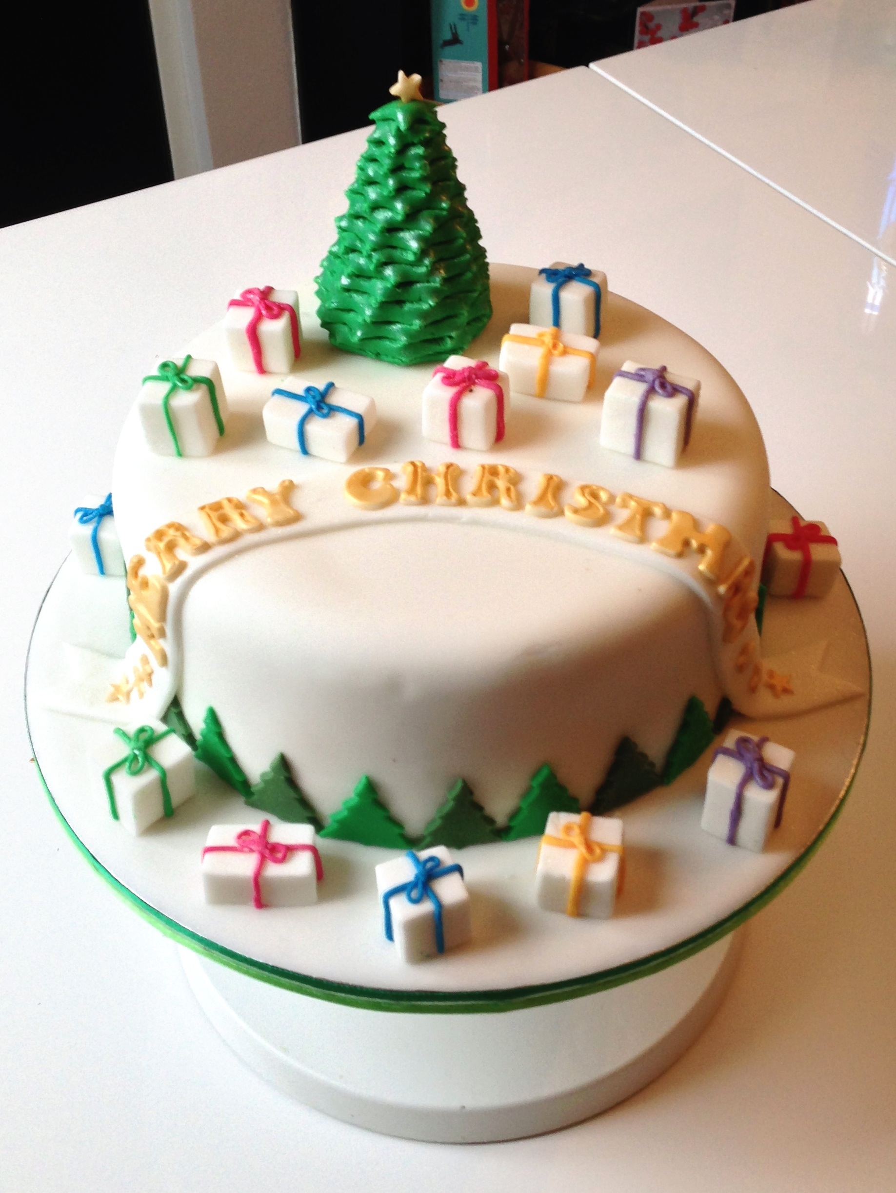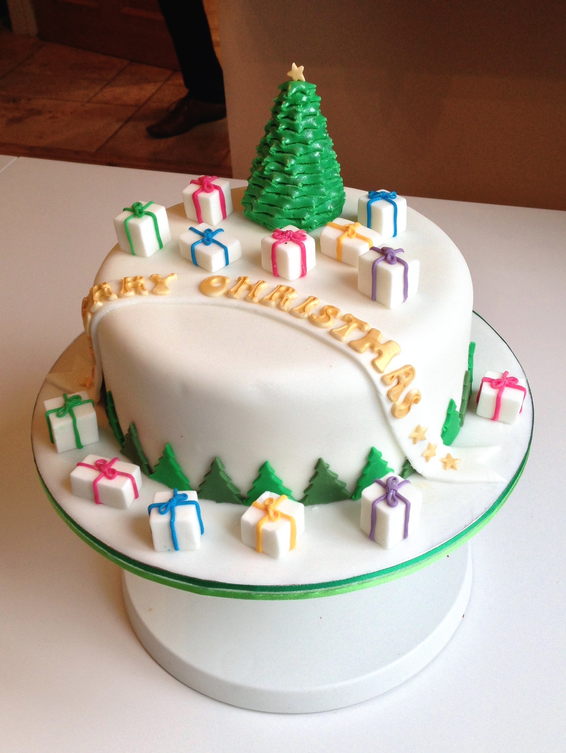 To put the cake together it was simply a case of positioning the pieces on the cake and the sugared cake board. The final touches were the Christmas Trees around the bottom edge (cut from two different shades of sugarpaste rolled to 1-2mm thick). These were to disguise the join between the cake and the board.