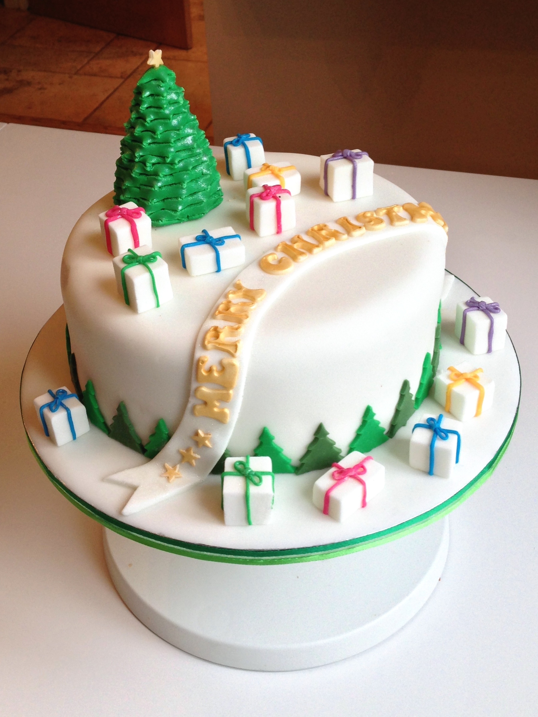 I also added the Merry Christmas banner across the top which was cut from white sugar paste with lettering brushed with gold edible dust.